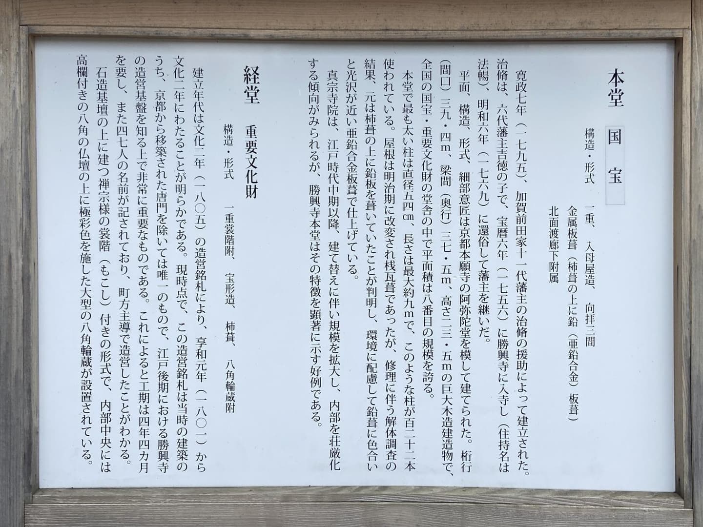また現在のような壮麗な建築群の建設は、前田利常や前田家11代当主(第10代藩主)となった前田治脩(はるなが、幼少時に勝興寺に入寺し住職に)の影響が大きかったようです。